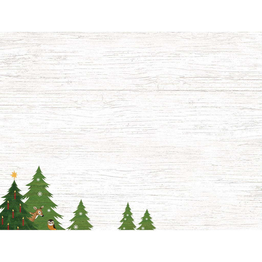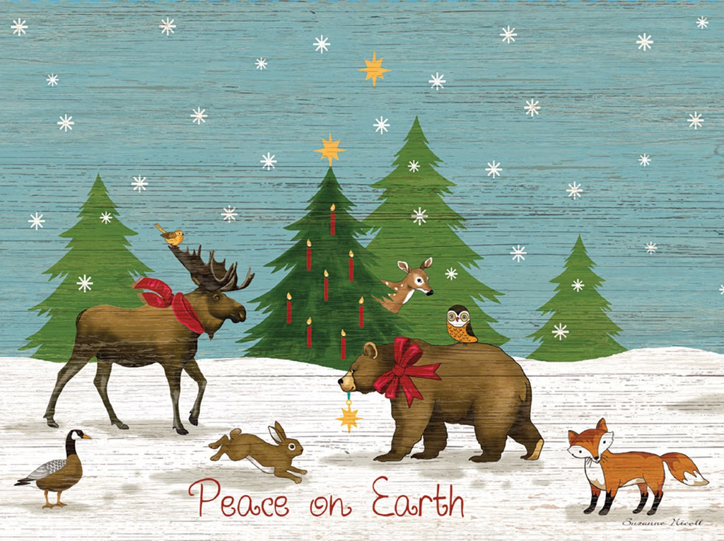 This Christmas card is adorned with lovable woodland creatures, including a hopping bunny, decorating a Christmas tree! Artwork by Suzanne Nicoll.